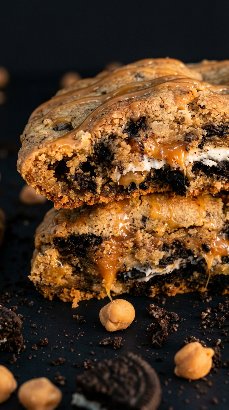 Cookies & cream dough with Oreo chunks, Oreo stuffed, caramel stuffed, and Ghirardelli caramel drizzle.