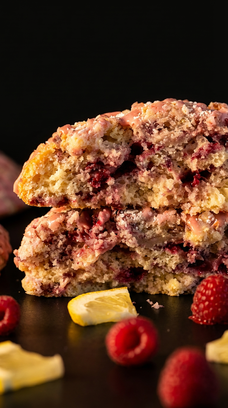 Fluffy lemon dough with fresh raspberries, powdered sugar dusting, and lemon raspberry icing.