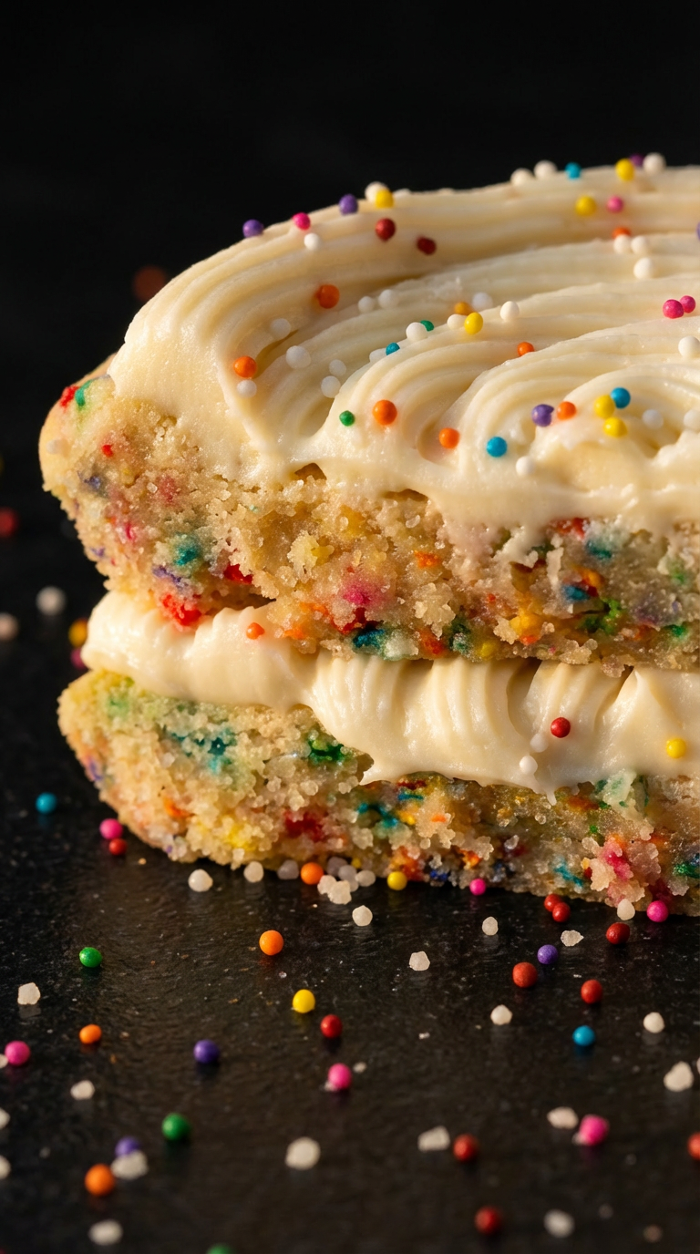 Signature sugar dough with nonpareil rainbow sprinkles and cake batter frosting.