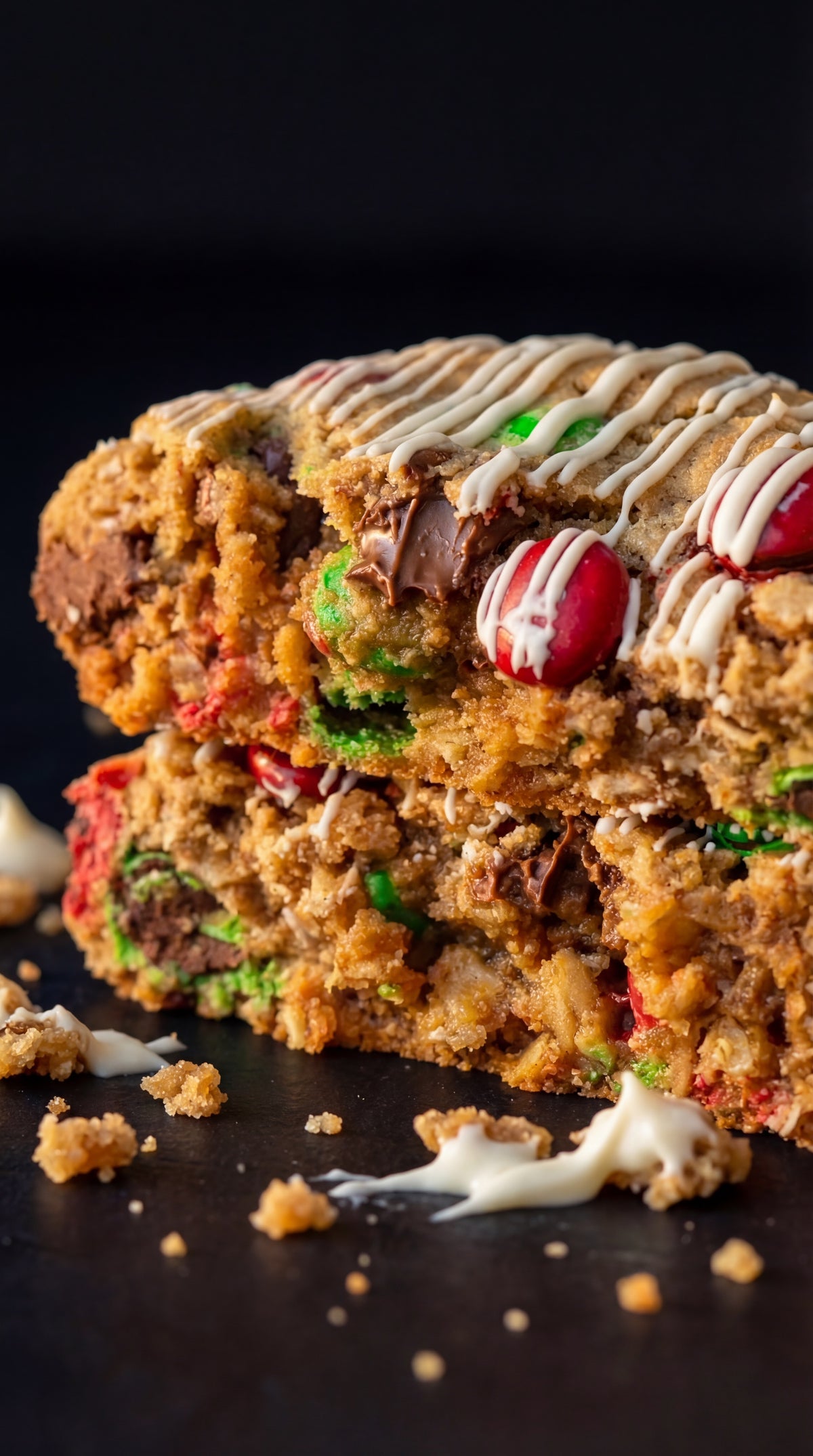 Oatmeal dough w/ a hint of peanut butter + festive M&Ms + white chocolate drizzle. Looks innocent. Isn't.