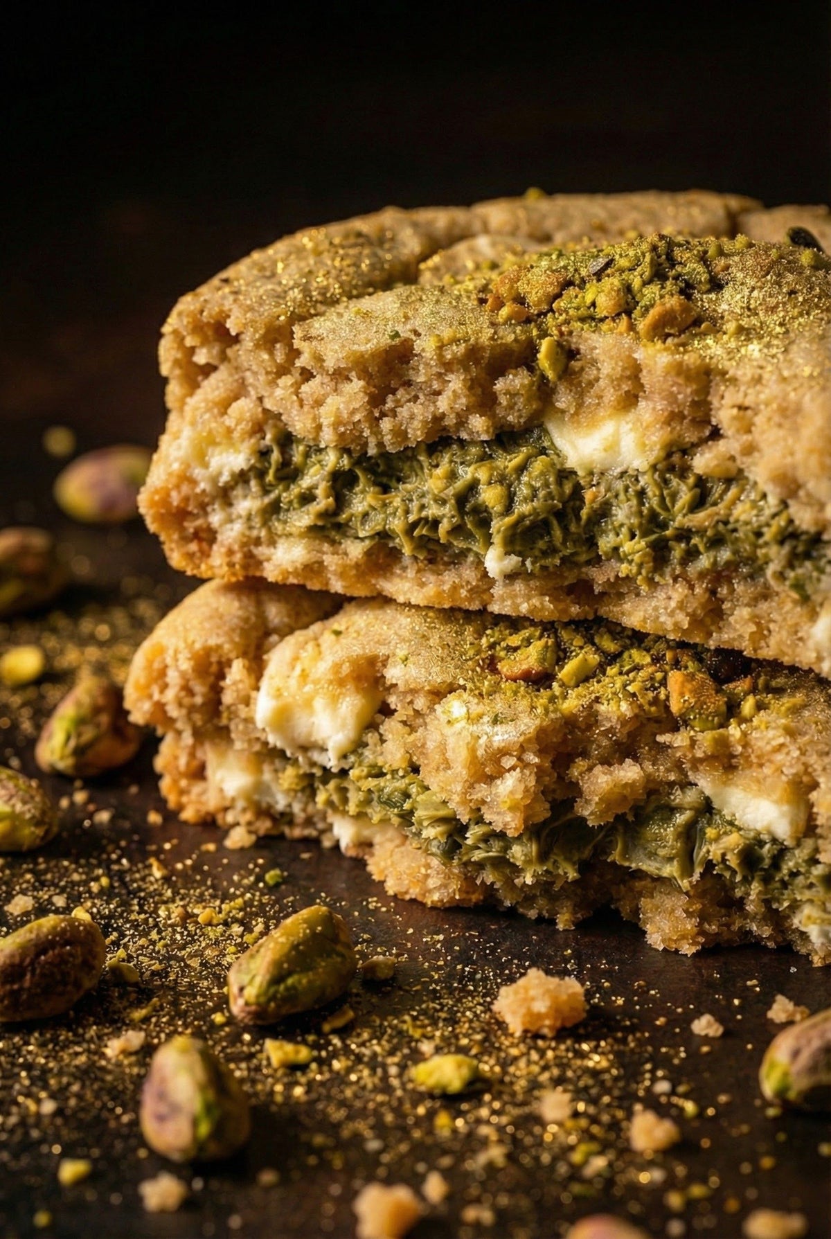 Signature dough with pistachio cream, toasted kataifi, white chocolate, pistachio, and edible gold.