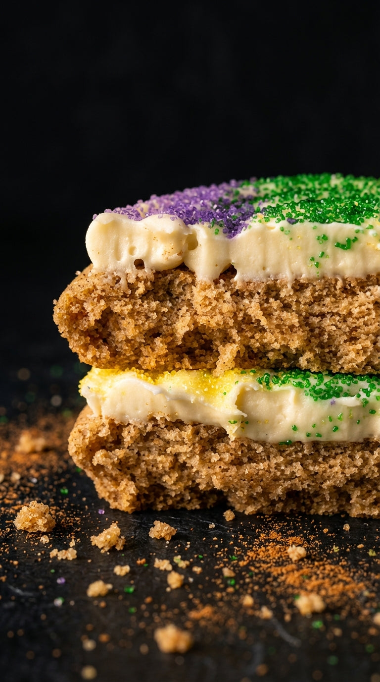 Snickerdoodle dough with cake batter cream cheese frosting and Mardi Gras sanding sugar.