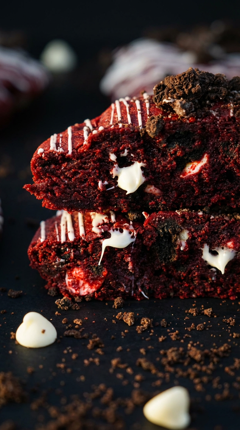 ed velvet dough with white chocolate chips, Oreo chunks, and white chocolate drizzle.
