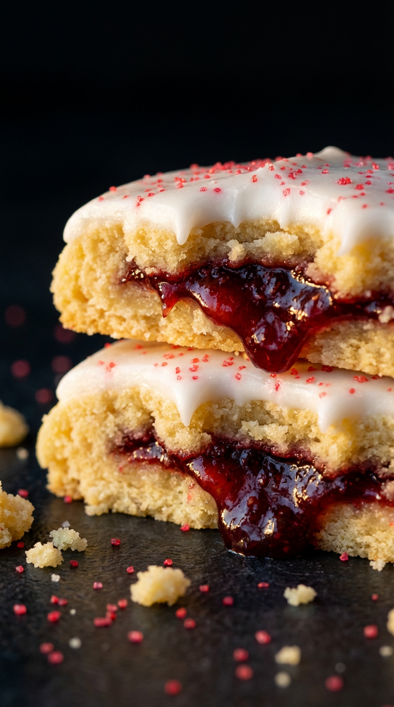 Pastry sugar dough with strawberry filling, vanilla icing, and red sanding sugar.
