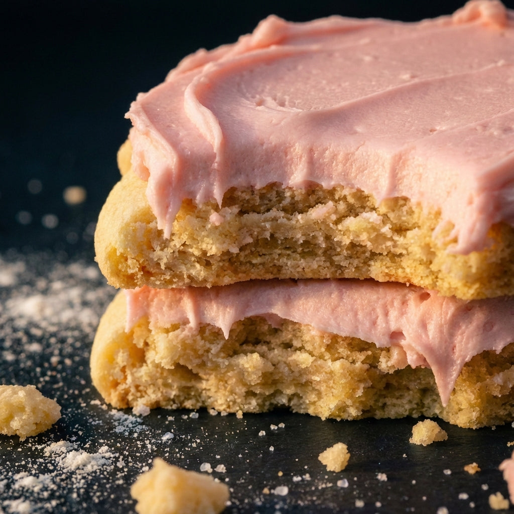 Signature sugar dough with pink vanilla buttercream frosting. The Valentine’s cookie.