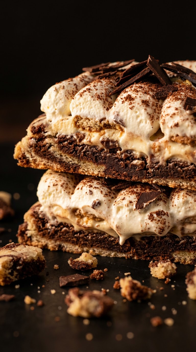 Marbled sugar dough with espresso dipped wafers, sweet cream spread, whipped cream, and chocolate.