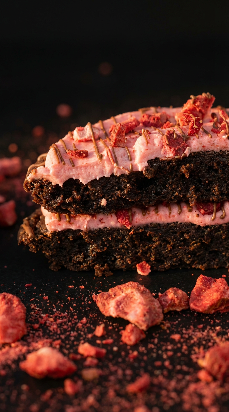 Chocolate dough with strawberry cream frosting, freeze dried strawberry, and chocolate drizzle.